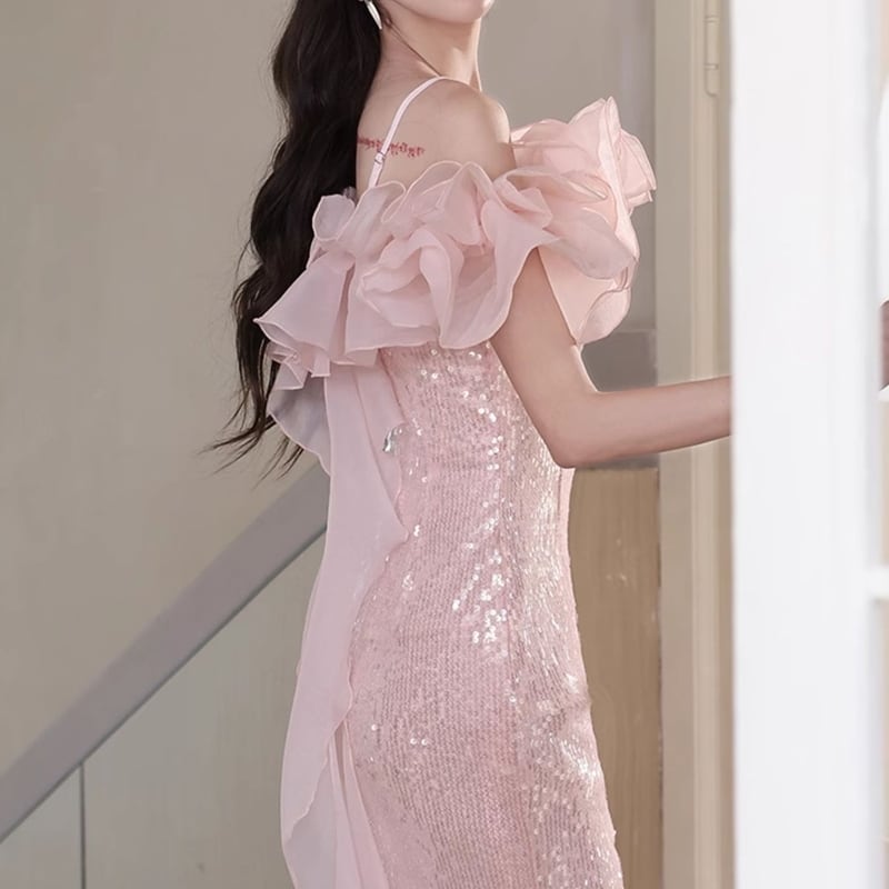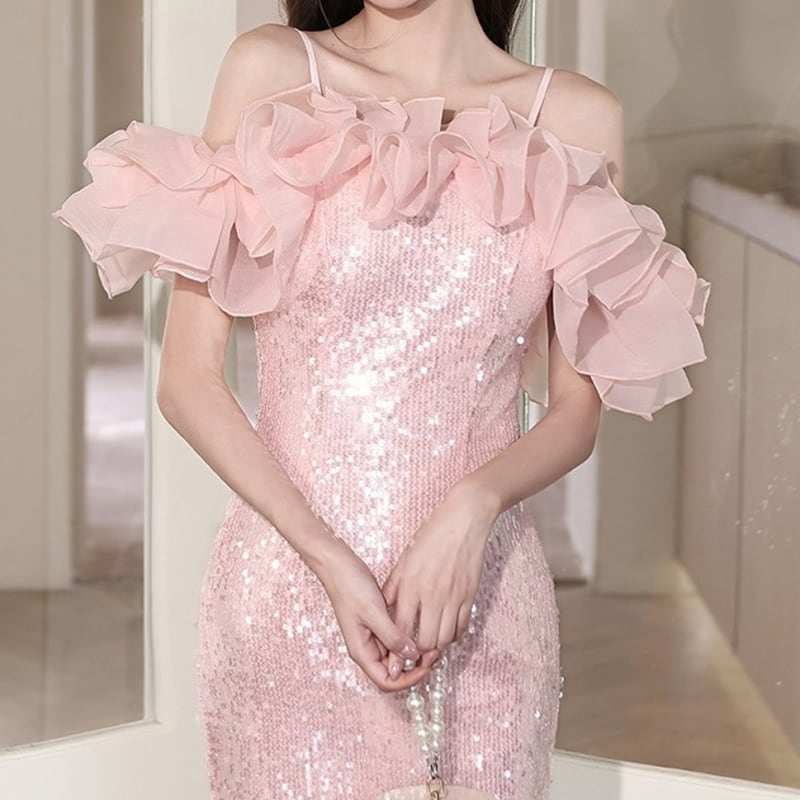 華奢なストラップとふんわりフリルが可愛いオフショルダー風ドレス。