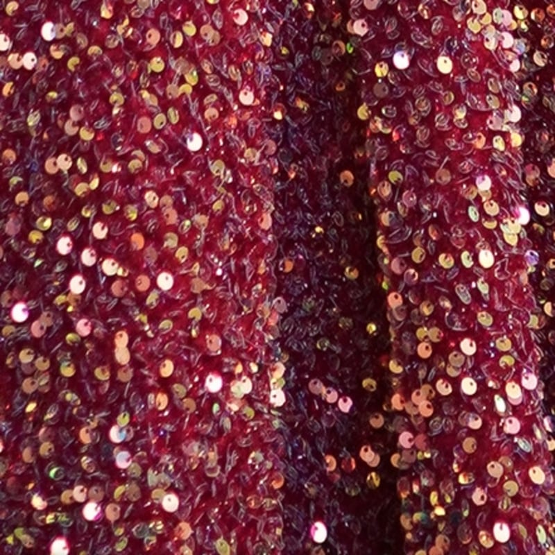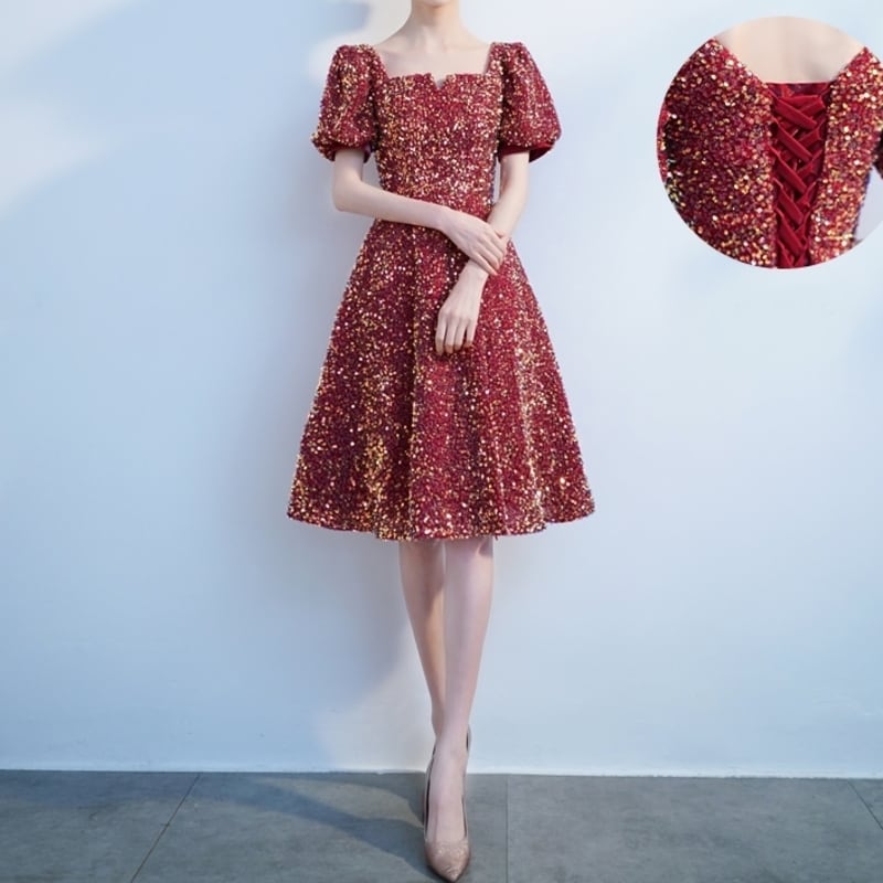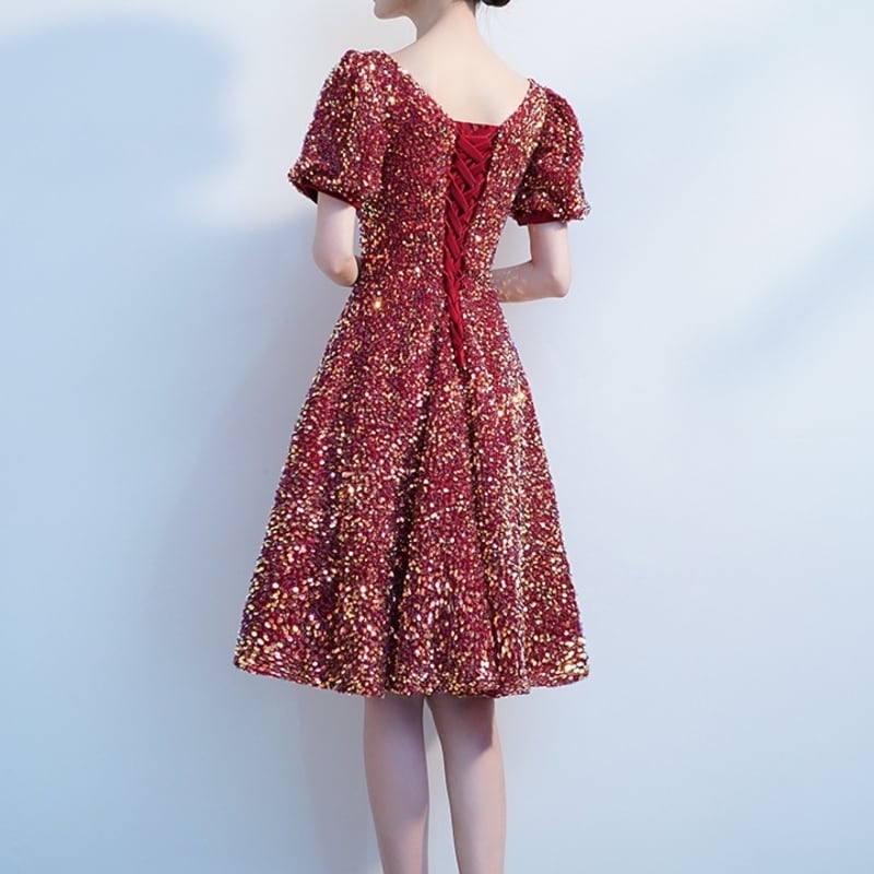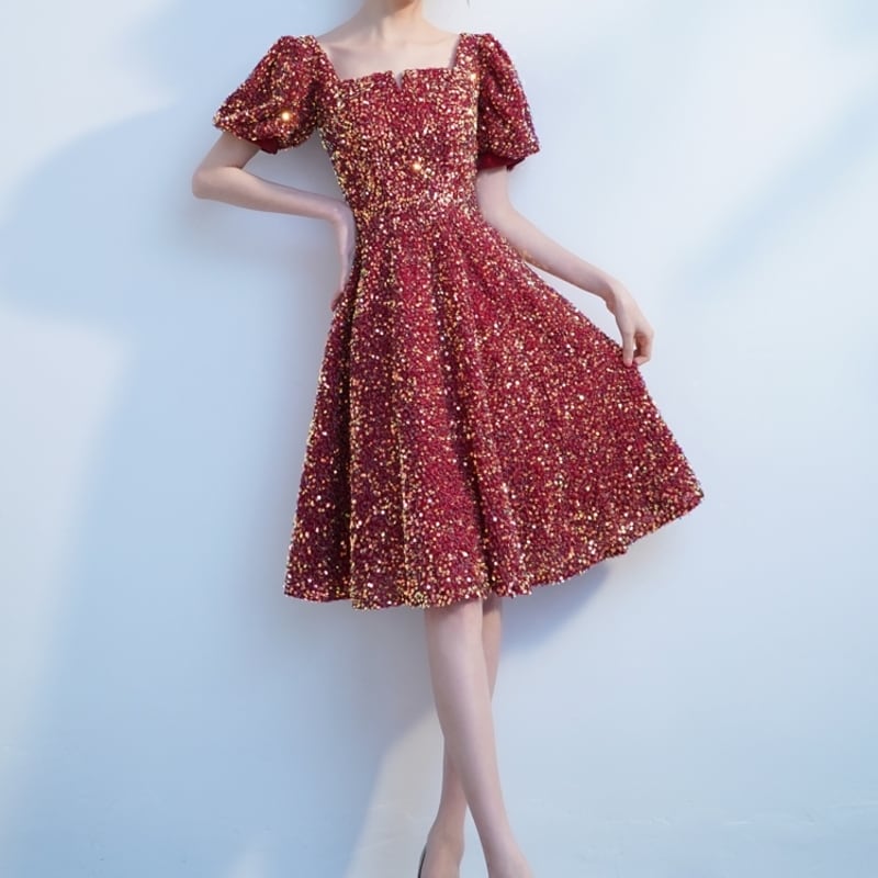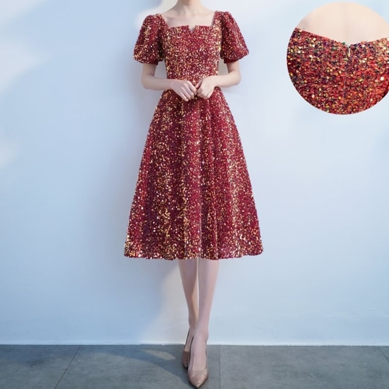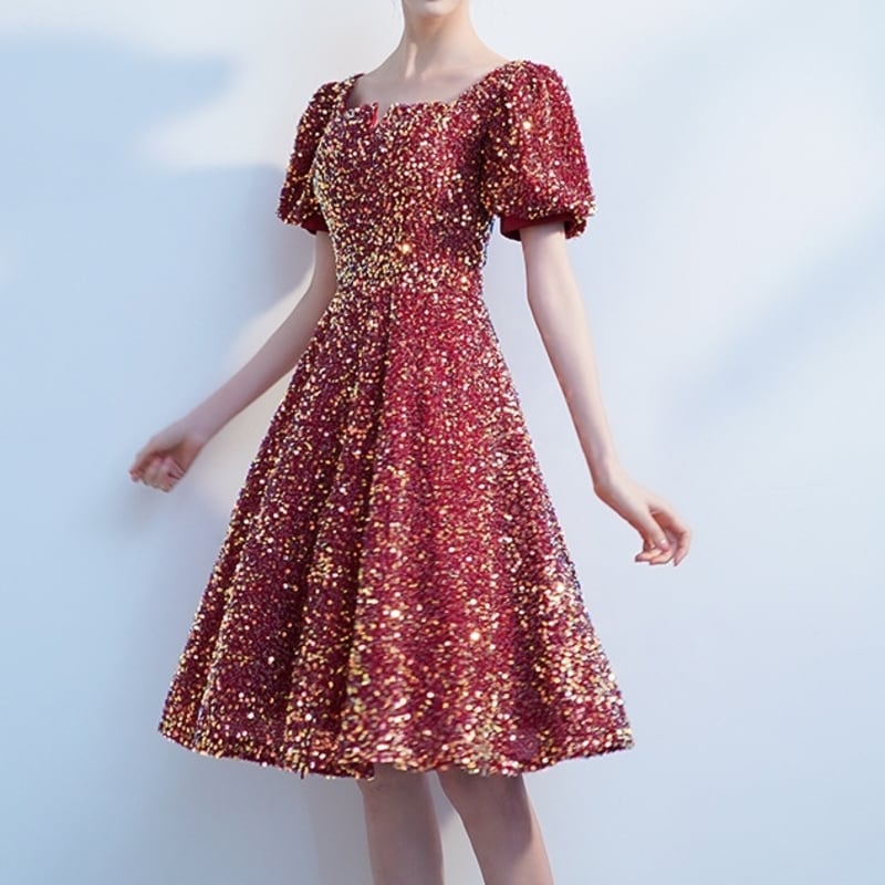 きらめくグリッターを全体に散りばめたスクエアネックのフレアドレス。