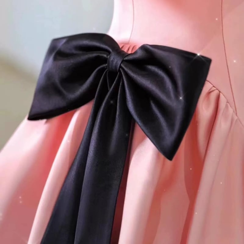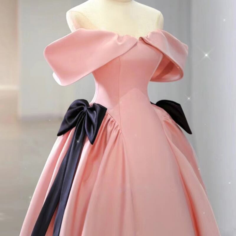 ブラックのリボンが映える淡いピンクのオフショルダーロングドレスです。