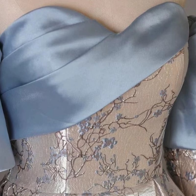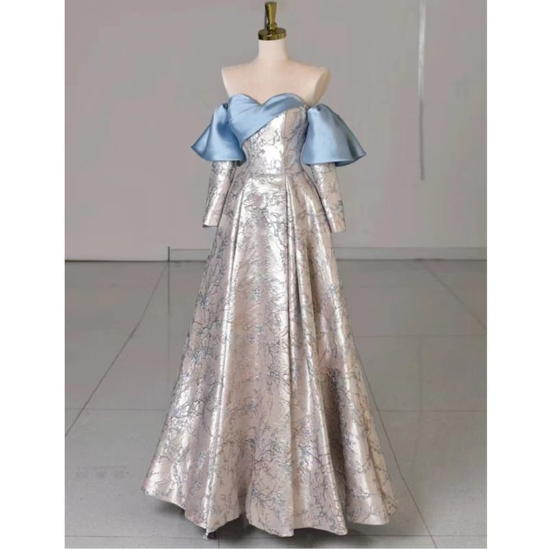 クラシカルな袖とバイカラーのデコルテデザインが華やかなロングドレスです。