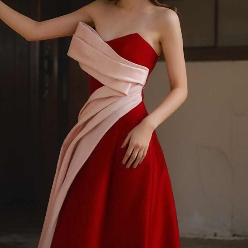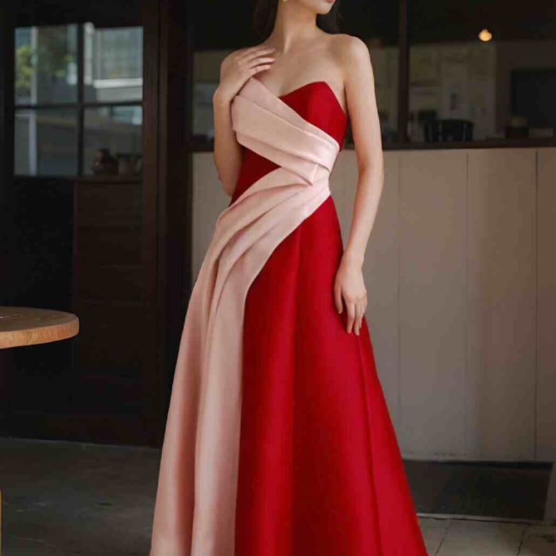 鮮やかなレッドカラー目を引くイブニングドレス。肩からのドレープのデザインが縦のラインをより強調し、スタイルアップして見えます。
