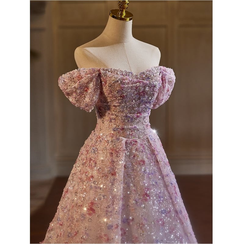 ふんわりパフスリーブがフェミニンなオフショルダーロングドレス。