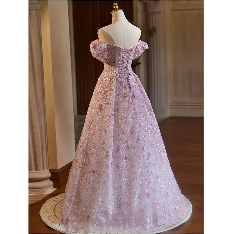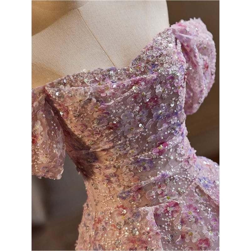 フラワーモチーフを散りばめた華やかデザインにスパンコールがきらめく一着です。