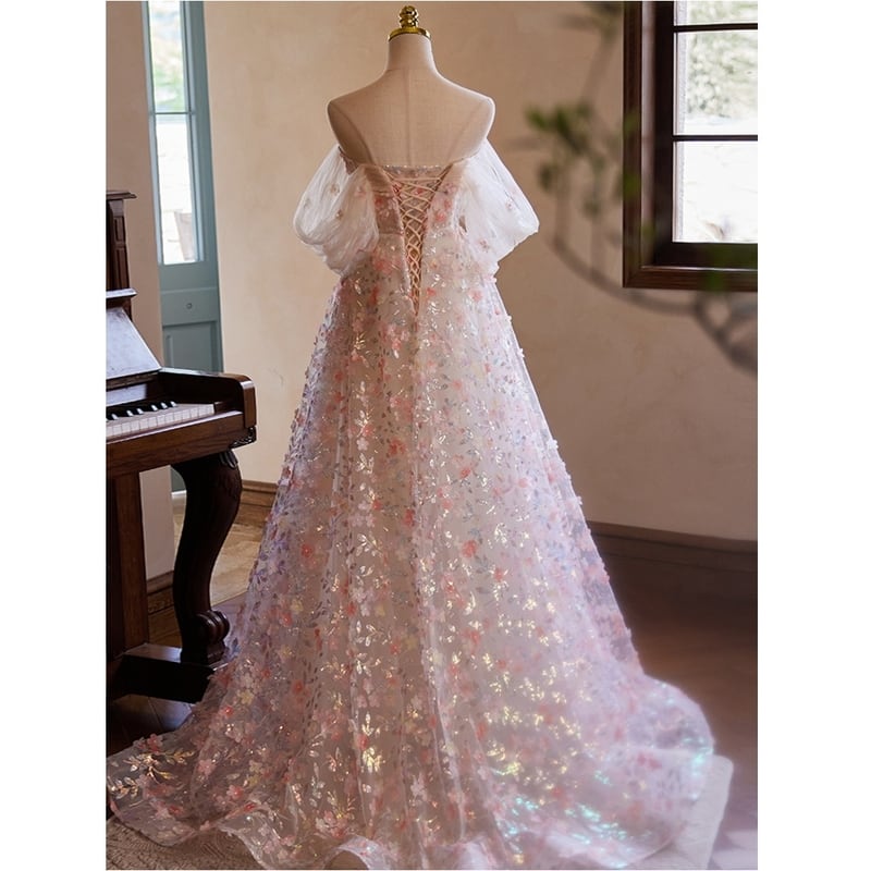 チュール&刺繍フラワーロングドレス D0208