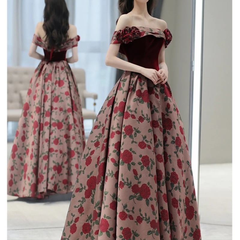 オフショルダーのデコルテにバラのモチーフをあしらったゴージャスなドレスです。