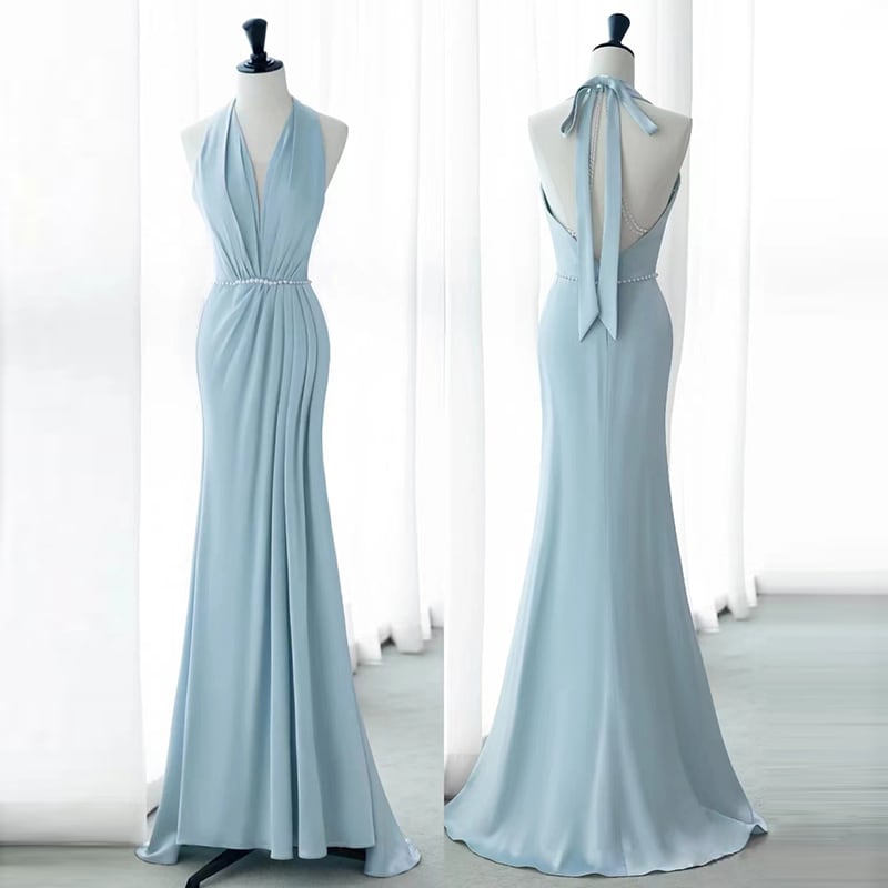 デコルテにぬけ感を作るホルターネックと大胆なバックオープンのロングドレスです。