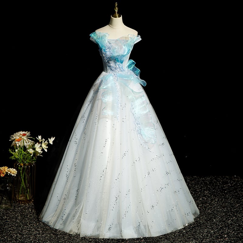 海を連想させるマーメイドのような透け感のあるオーロラ色のチュールが華やかなロングドレス。