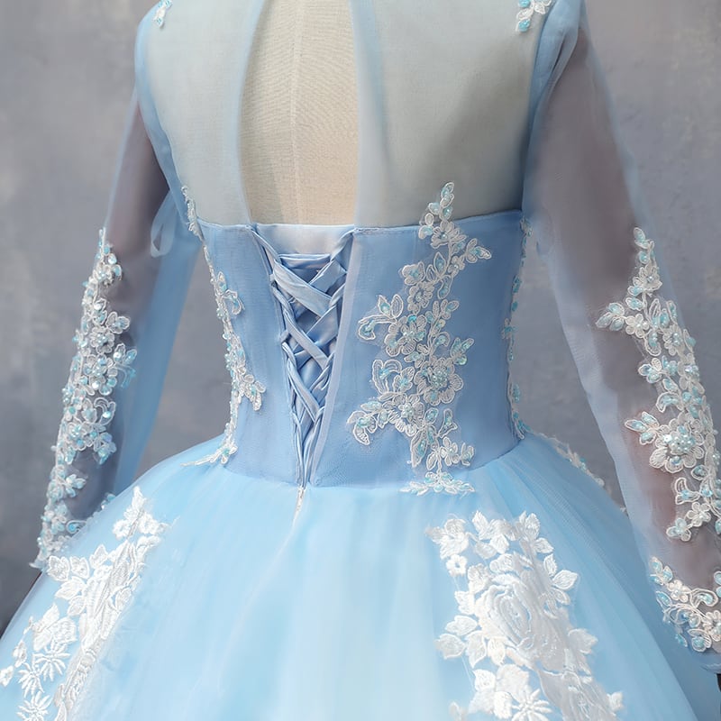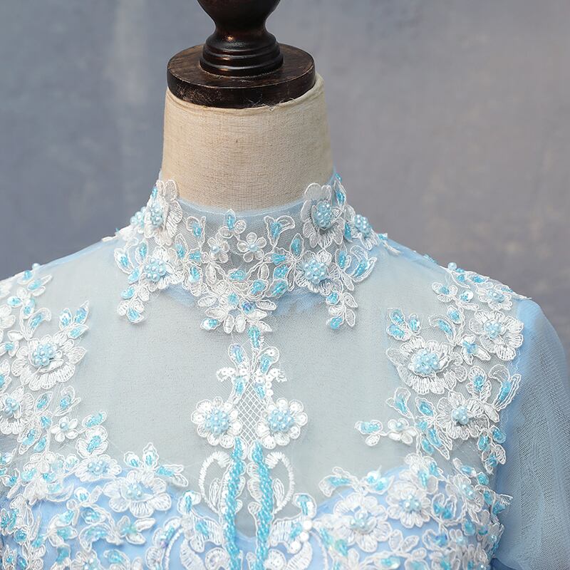 クラシカルな花柄の刺繍がブルーのチュールに映える、バックオープンデザインの一着です。