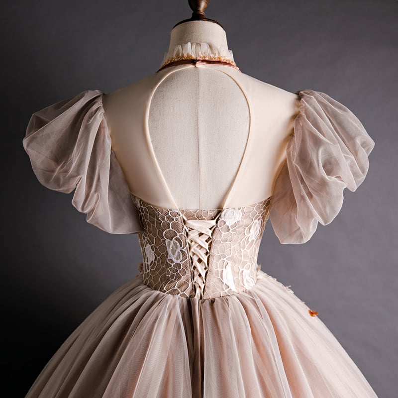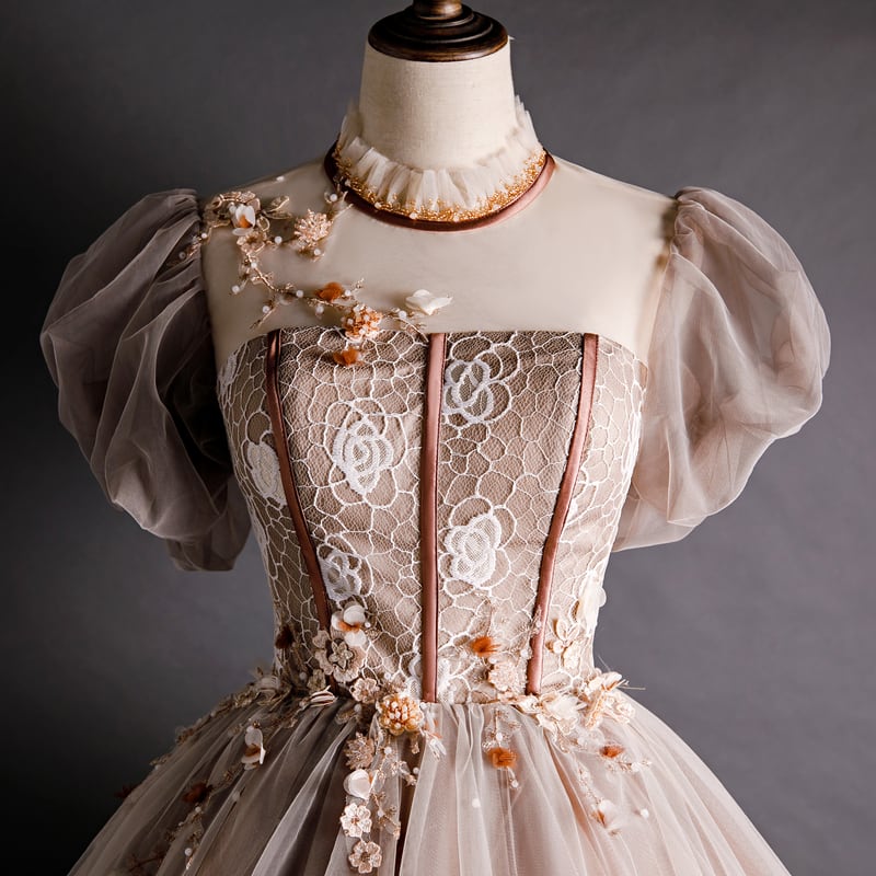 デコルテ周りの透け感が上品なフリルのスタンドカラーロングドレスです。