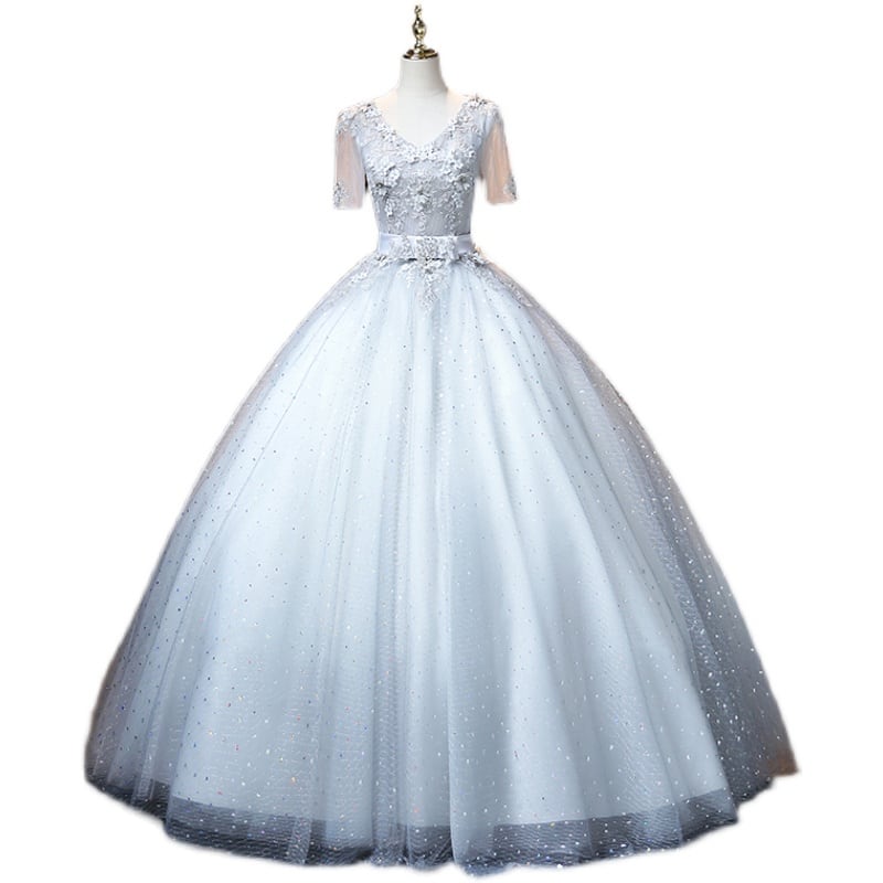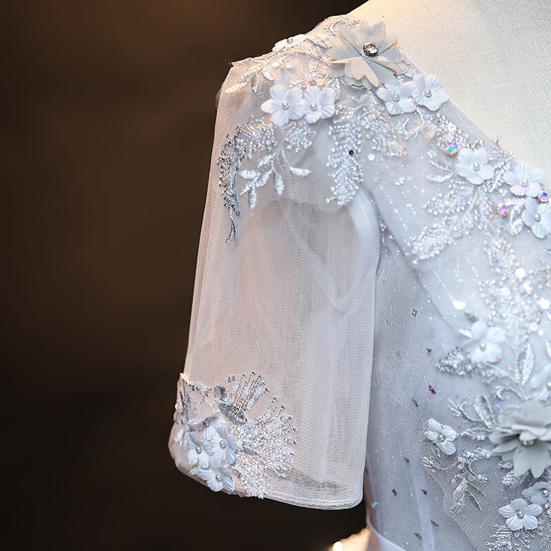立体的な花柄刺繍とラインストーンがゴージャスでくすみブルーがシックな一着です。