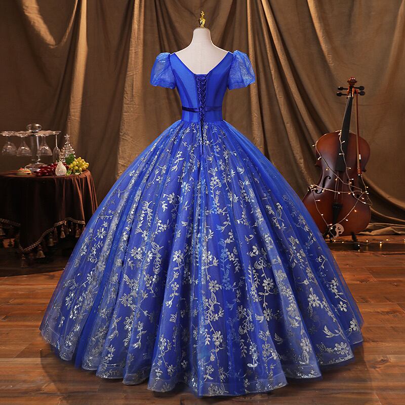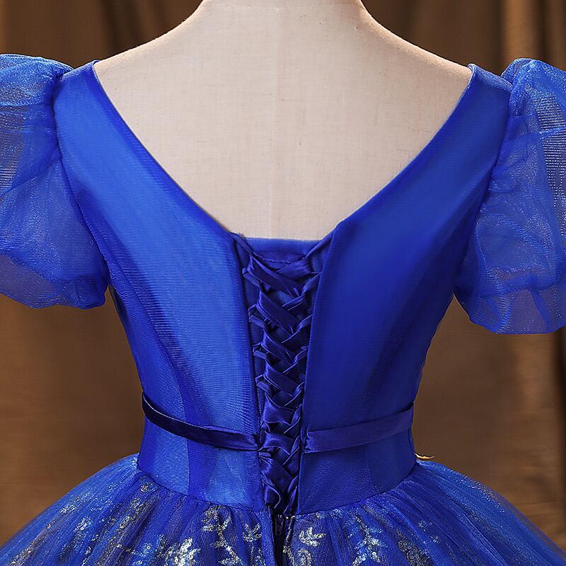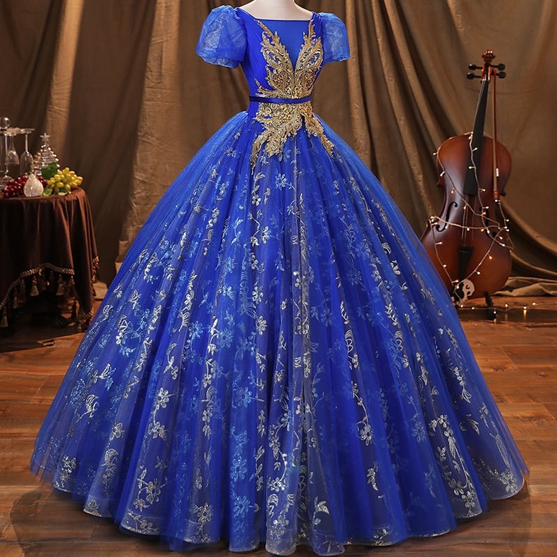 ブルーにゴールドの刺繍とフローラルプリントが映えるロングドレスです。