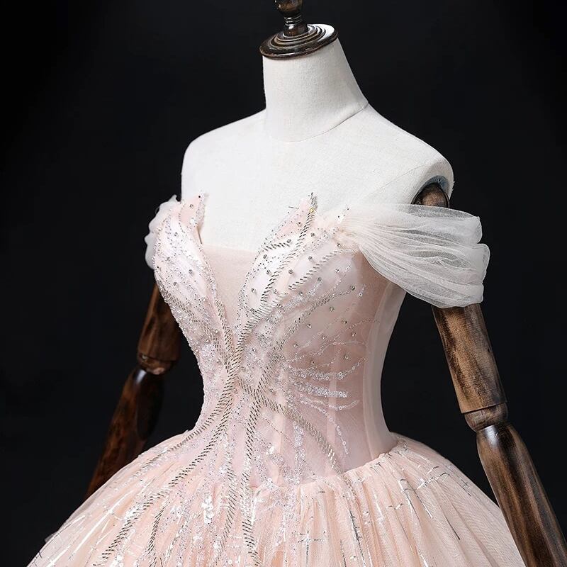 オフショルダー風のデコルテデザインが華やかなチュールドレスです。