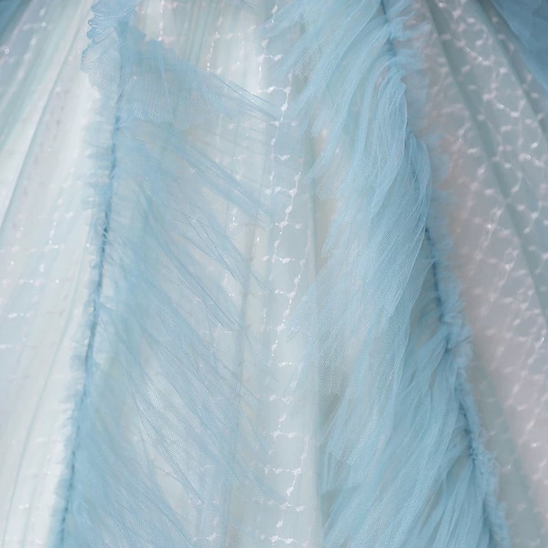 チェック柄のチュールの透け感と淡いブルーのフリルで立体感が華やかな1着です。