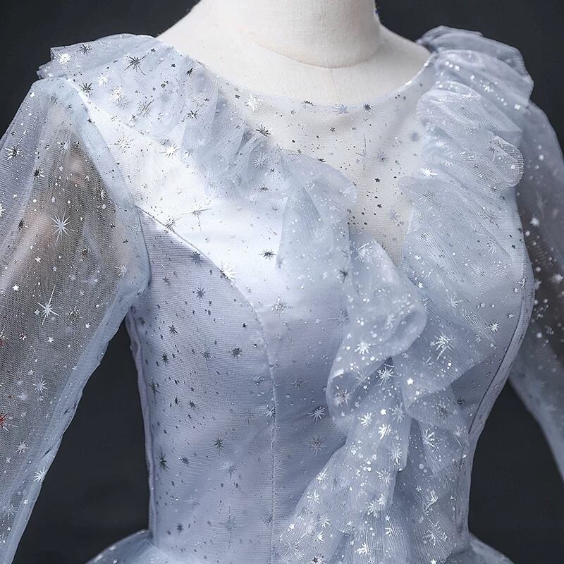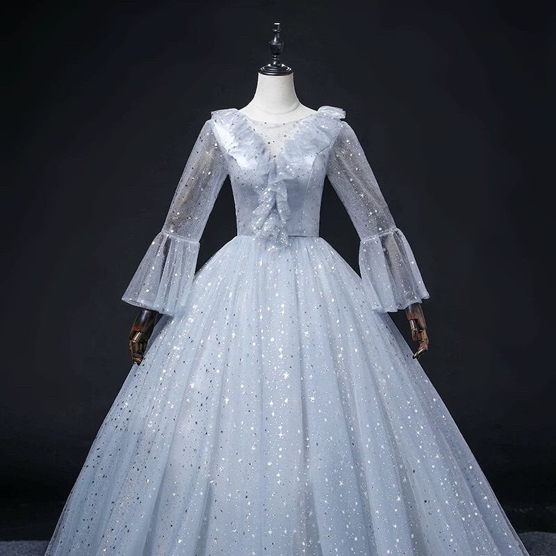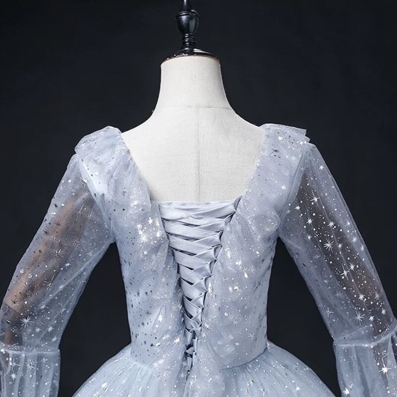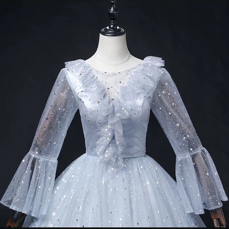 星柄のメタリックプリントが煌めくスカイブルーのロングドレスです。