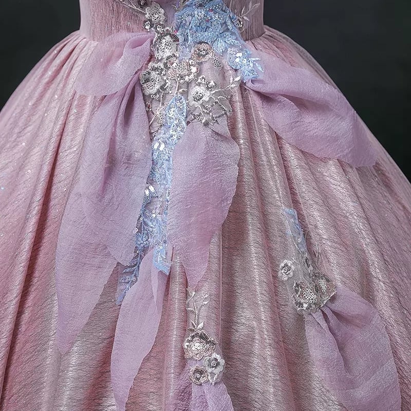 大きなフラワーモチーフと花びらが落ちるアシンメトリーデザインのドレスです。