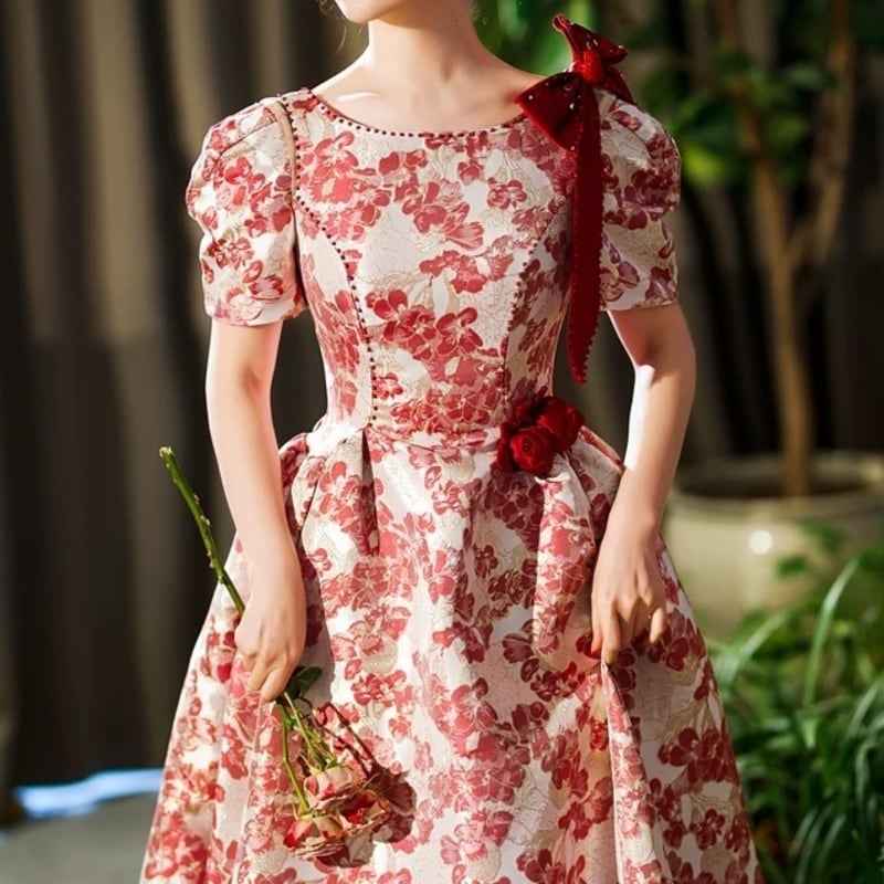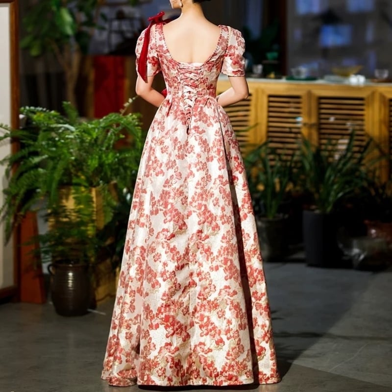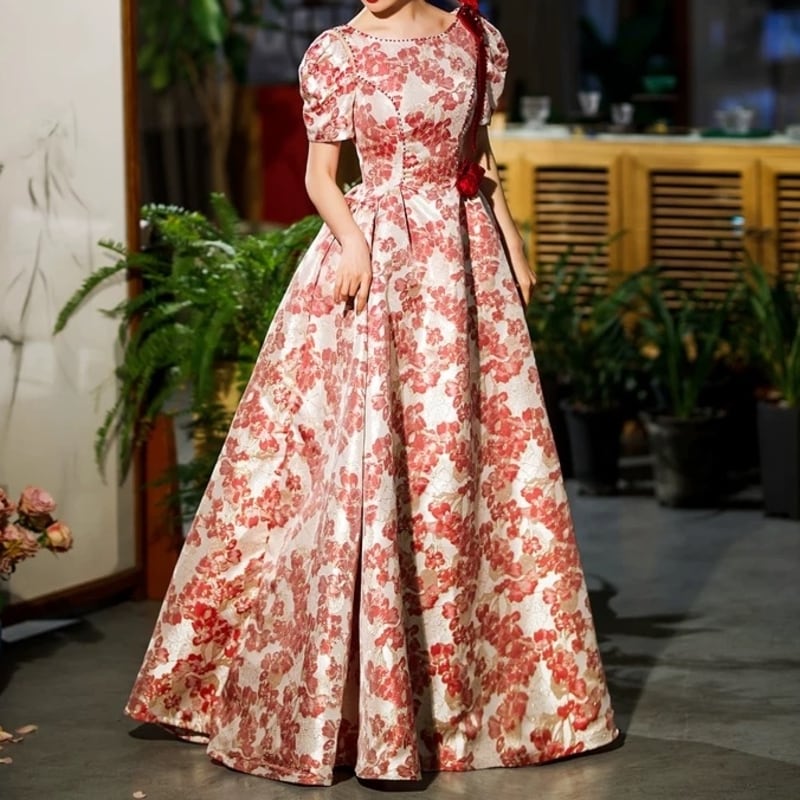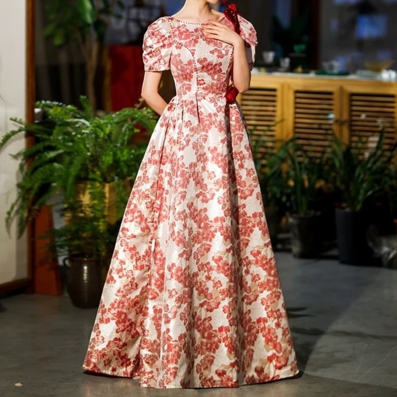 ツヤ感のあるジャガード調の高級感漂う花柄生地がシックなロングドレスです。