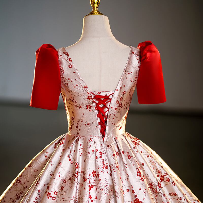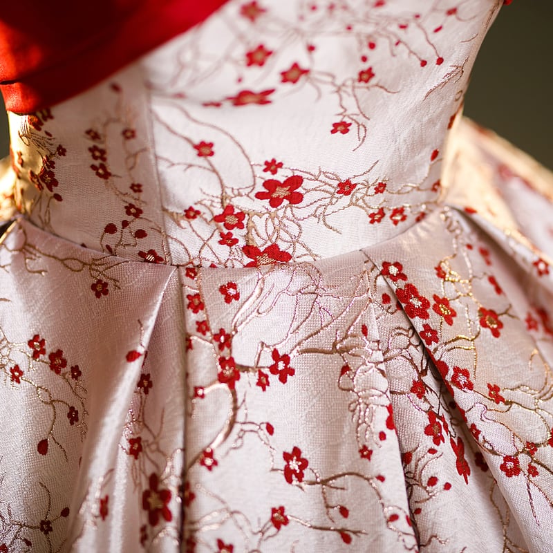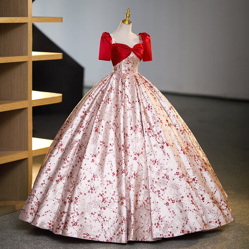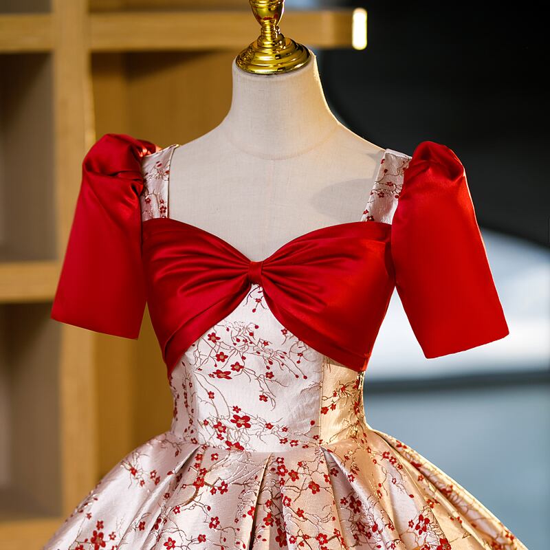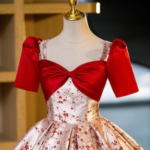 パワーショルダーとリボン型とバストのデザインがガーリーなロングドレスです。
