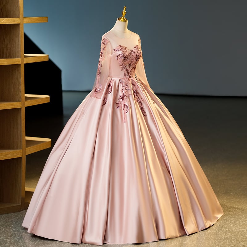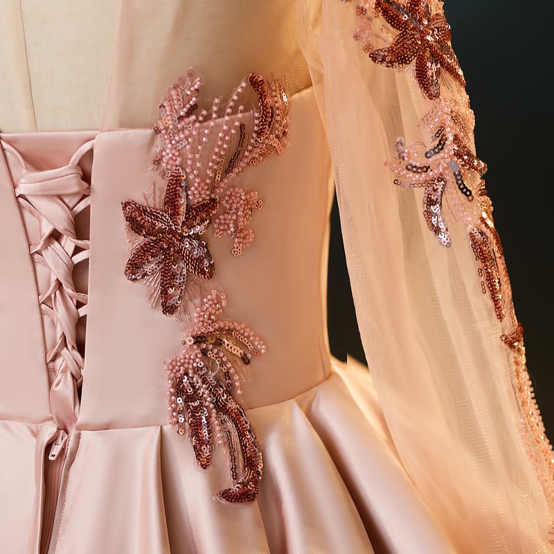 デコルテと袖のチュール切り替えで上品な透け感をいかしたサテンドレスです。